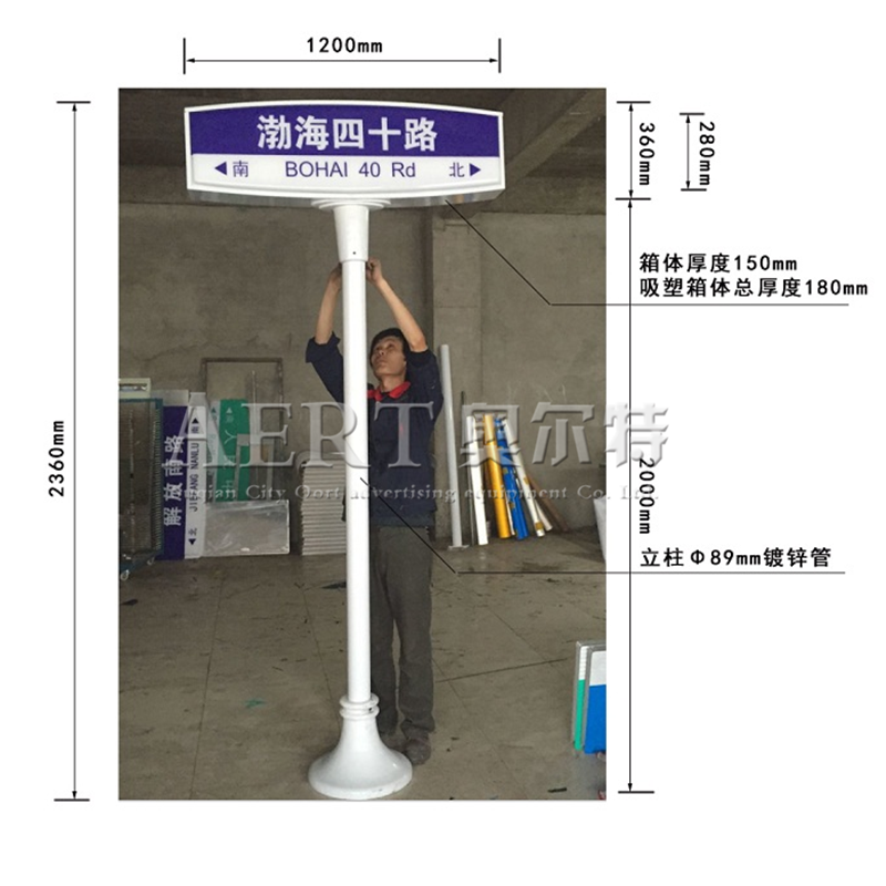 • ①主幹道立杆尺寸:單根直徑89mm熱度管(guǎn),厚度:2.5mm牌麵底部距地麵2500mm