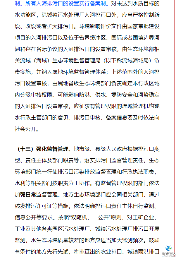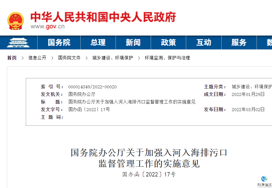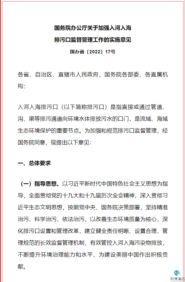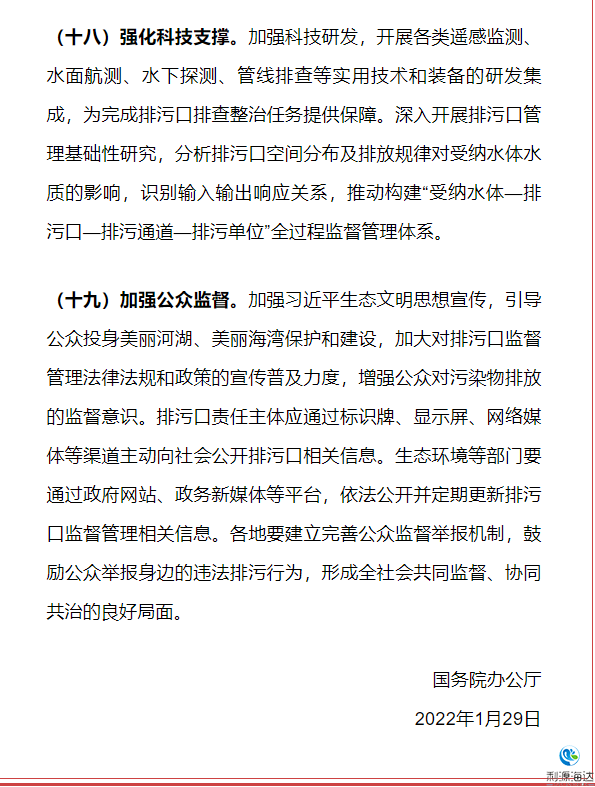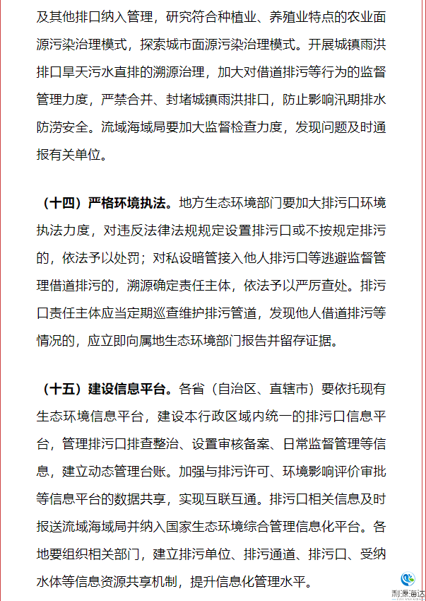 3月(yuè)2日,國務院辦公(gōng)廳發布(bù)《關於加強(qiáng)入河入海排汙口(kǒu)監督管理(lǐ)工作(zuò)的實(shí)施意見》(以下簡稱(chēng)“意見”),標誌著入河入海(hǎi)排汙口監督管(guǎn)理工(gōng)作正式全麵(miàn)啟動。將構建“受納水體—排汙口—排汙通道—排汙單位”全過程監督(dū)管理體係(xì),以有效管控入(rù)河入海汙染物排放。