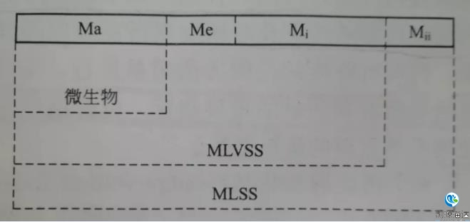 注(zhù):Ma--具有代謝(xiè)功能活性的微生物群體;Me--微生(shēng)物(主要是細菌(jun1))內(nèi)源代謝、自身(shēn)氧化的殘留物;Mi --由原汙水挾入的難為細(xì)菌降解的惰性有機物質;Mii--由汙水挾入的無機物質。