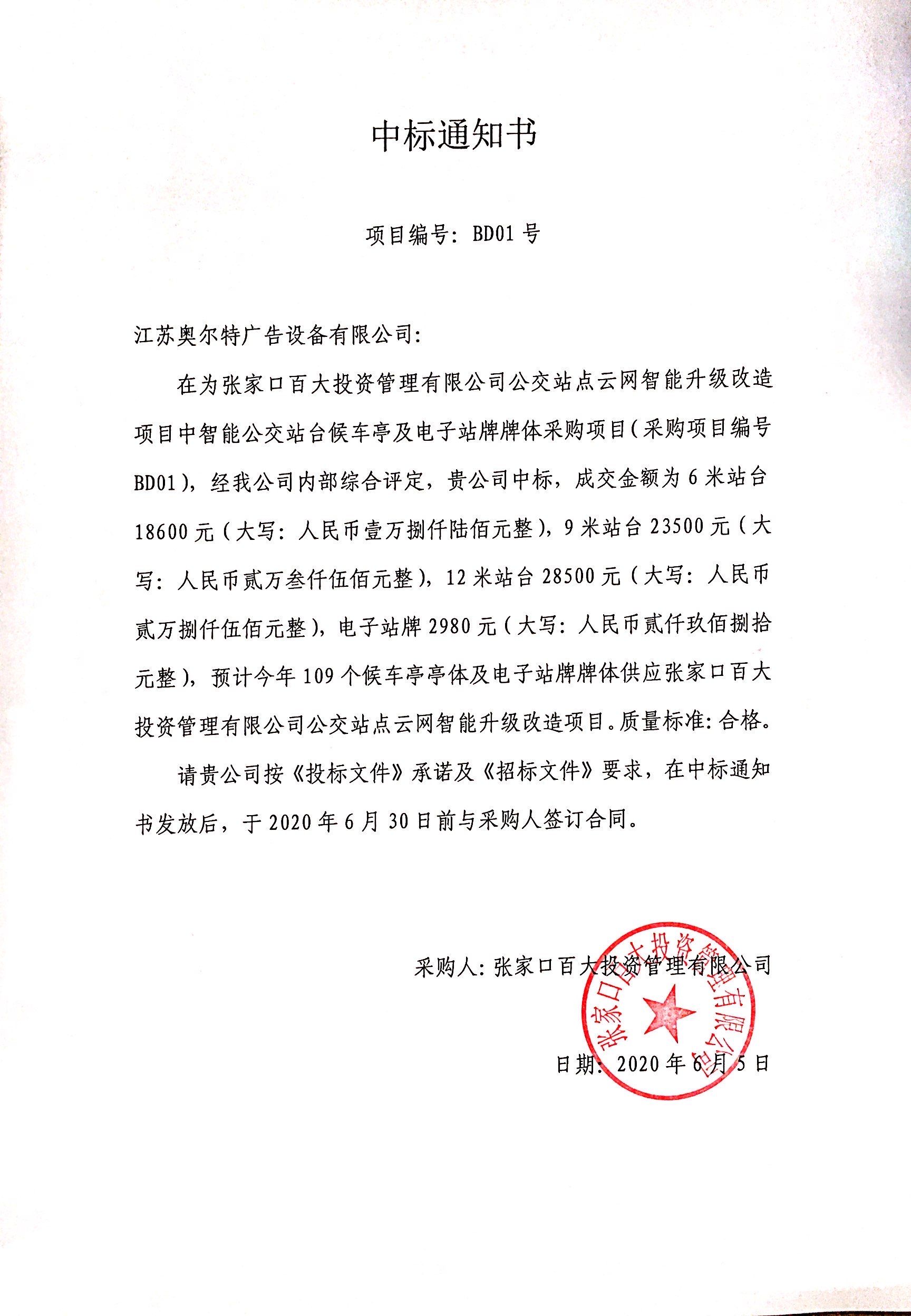 中標喜訊!恭喜(xǐ)「江蘇香蕉丝瓜草莓秋葵小猪IOS污」中標 :張家口智能公交站台候車亭及智能站牌項(xiàng)目;