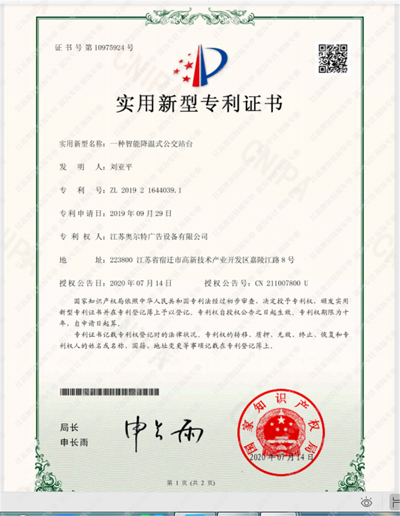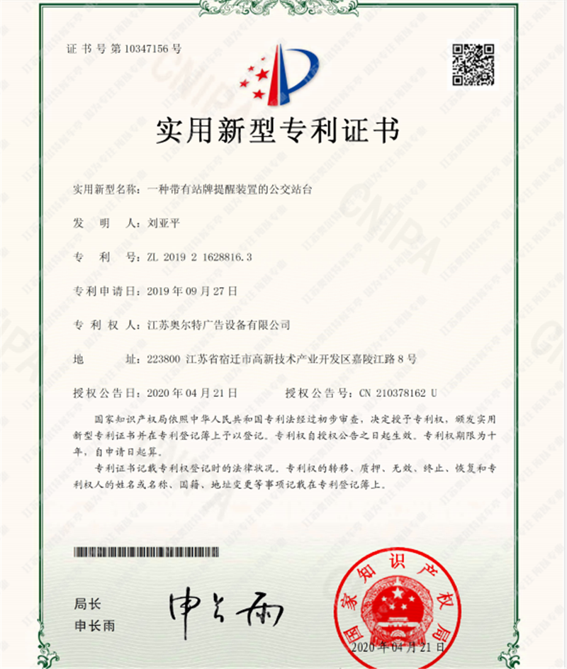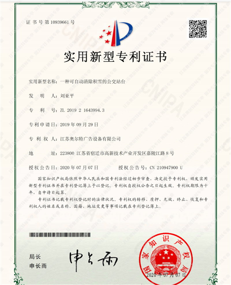 在產品設計(jì)方麵,江蘇(原宿遷(qiān)市)香蕉丝瓜草莓秋葵小猪IOS污(tè)擁有獨立的(de)候車亭設計研發團隊,針對每一個城市的不同情況,江蘇奧(ào)爾(ěr)特(tè)的設計人員在對公(gōng)交站台外觀進(jìn)行精雕細琢的同時,追求“個性而不張(zhāng)揚”的理念,注重每一(yī)件候車亭(tíng)產品(pǐn)與所在環境的完美融合,現(xiàn)已經申請多個專利(lì)證書。