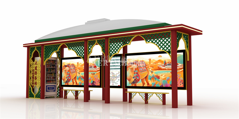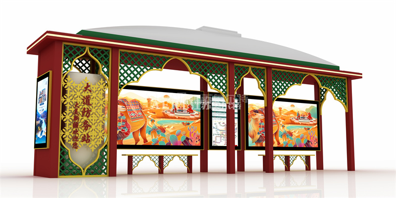宿遷智能(néng)候車亭廠家本次為新疆大道防務(wù)站設計的一款極具新疆特色的公交站台(tái),造型美觀華麗,功能實用。
