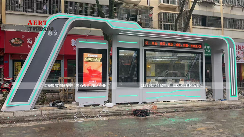 江(jiāng)西修水智慧公交站台(tái),配備55寸LCD液晶屏幕,可實時顯(xiǎn)示公交(jiāo)車輛的(de)運行狀態、到離站時間及站點、線路、換乘信息等。