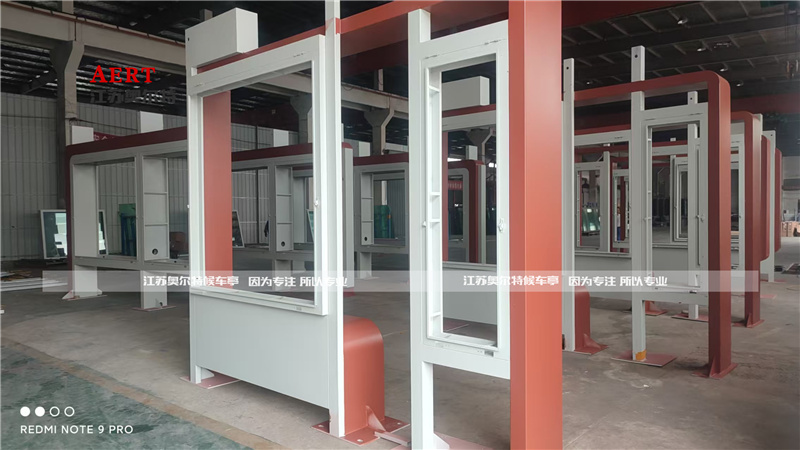 吉林延邊智能候車亭(tíng)整體(tǐ)采用鍍鋅鋼板,噴(pēn)塗淺灰色氟碳漆,搭配橙色裝飾,具有現代風格。
