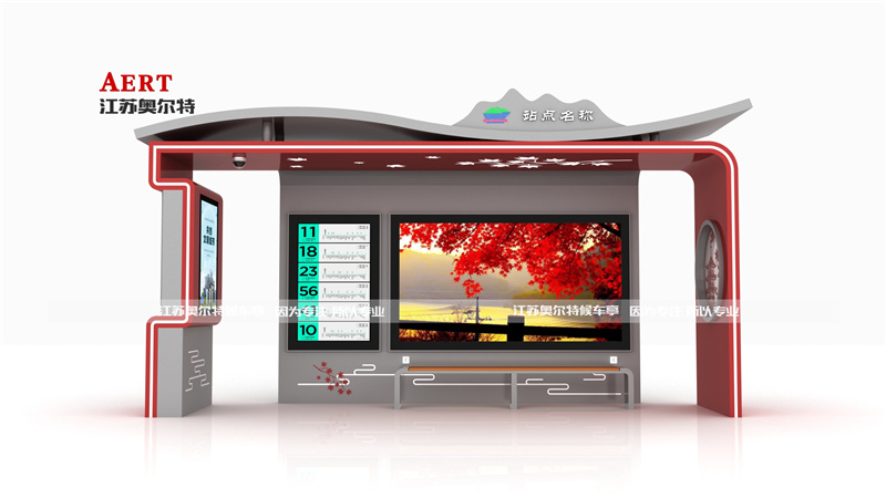 從設計元素看,候車亭以紅(hóng)葉為核心符號,正麵的(de)大幅紅葉景觀(guān)畫麵呼應(yīng)了蛟河紅葉穀的絕美(měi)秋色,頂部和立(lì)麵的楓葉裝(zhuāng)飾細(xì)節進一步強化(huà)了這一主題(tí)。同(tóng)時,融入了中式建築風格,如右側的亭閣剪紙元素、頂部的(de)山(shān)巒造型,體現出蛟河的地域文化底蘊。