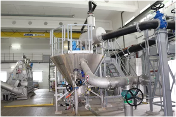 該汙水處理廠年汙泥生成量為19,600噸。廠內(nèi)有三台離(lí)心機(jī)用於剩餘汙泥脫水處(chù)理,五台離心機用於發酵汙泥的脫水。汙泥(生物質含量1.22%)添(tiān)加絮凝劑後(hòu)(0.73克/克生物質)離心脫水(能耗1.5千瓦時/立方米(mǐ))最終達到生物質含量6.95%。離心過程(chéng)中脫(tuō)去的汙水(shuǐ)被輸送到厭氧池循環處理,脫水後的(de)淤泥被送入沼氣發酵池(運輸總耗能0.6千(qiān)瓦時/立方米)。