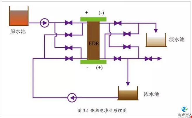 EDR工藝是我國(guó)根據ED原理於1982年研製成功的一種新工藝,它每(měi)隔(gé)一定時間(一般為15-20min),倒換正負電極極性(頻繁倒極),這樣能自動清(qīng)洗離子交(jiāo)換膜和電極表麵的汙垢,確保淡水的水質水量、離(lí)子交換膜穩定運行和濃水排放量最少,倒極電滲(shèn)析原理如圖(tú)3-1所示。