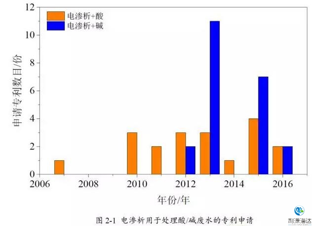 從檢索結果可知,有關電滲析技術在含酸(suān)/堿溶液方麵的(de)應用,申請的專利很少。近十年(nián)來,電滲析在酸液廢水中應(yīng)用的(de)專利大概有19項,而電滲析在堿液廢水中的(de)應用大概有22項,並且電滲析在堿液廢水中應用的(de)相關專利是在近5年內才出現的。