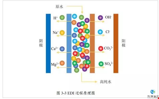 填充床電滲析又稱電脫離子法,是將離子(zǐ)交換膜與離子交換樹脂有機地結合在(zài)一起,在直(zhí)流電場的作用下實現除去水中已電離的或可電離的物質的一種新(xīn)型水處理技術。它(tā)利用電滲析過程(chéng)中極化現象對離子交(jiāo)換填充(chōng)床進行電化(huà)學再生,它巧(qiǎo)妙(miào)地集(jí)中了電滲析連續脫鹽與離(lí)子交換樹脂深度脫鹽這兩種方法的優點,並且克服了它們(men)的缺點(diǎn),即電(diàn)滲析過程的濃差極(jí)化(huà)現象和離子交換的化學再生過程。一般水中含鹽量(liàng)為(50-15000mg/L)時都(dōu)可使用,而對含鹽量低的水更為適宜。這種(zhǒng)方(fāng)法基本能夠除(chú)去水中全部離子,所以它在製備高純水及(jí)處理放射(shè)性廢水方(fāng)麵有著廣泛的用途。EDI過程原理如(rú)圖3-3所示。