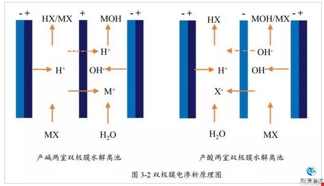 的特點是可與其他陰離子交換膜、陽離(lí)子交換膜(mó)進行巧妙組合(hé),組成許多獨具特點的雙極膜電滲析工藝(yì)。與電解脫水法相比,能耗大大降低,並能從鹽溶液中生成等摩(mó)爾的(de)酸和堿,所以此技術可(kě)用於廢酸、廢堿等物質的再生和利用,降(jiàng)低物質和能源的消耗(hào),減低廢物(wù)排放,消除環境汙染以(yǐ)及為(wéi)某些酸和堿的分離與製備提供新的途徑,雙極膜電滲析的圖原理如圖3-2所示。