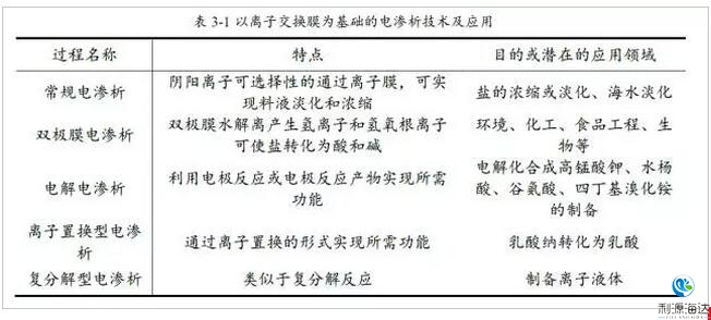 以離子交換膜為基礎的電滲析技術及應用如表(biǎo)3-1所示。
