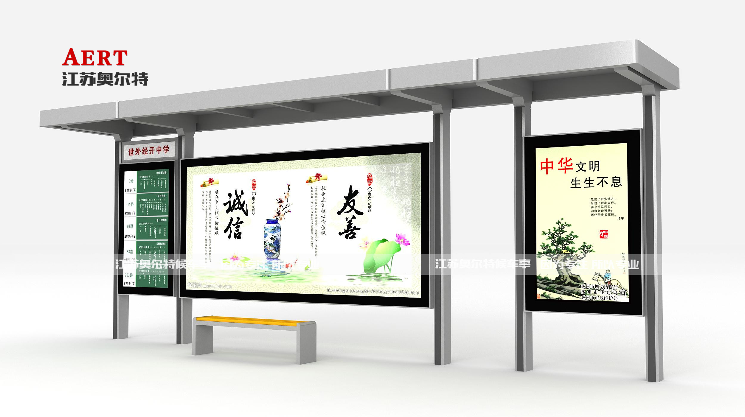 | 候車亭尺(chǐ)寸 | 一大一小尺寸:寬7米,高2.9米,寬(kuān)1.5米 二大一小尺寸(cùn):寬12米,高2.9米,寬1.5米 三大一小尺(chǐ)寸:寬17米,高2.9米,寬1.5米 標準大燈箱(xiāng)尺寸:寬3.65米,高1.8米(mǐ) 標(biāo)準小燈箱尺寸:寬1.2米,高1.8米 注:可根據客戶需求進行定製,采用模塊化設計,組合方(fāng)式靈活多變。 |